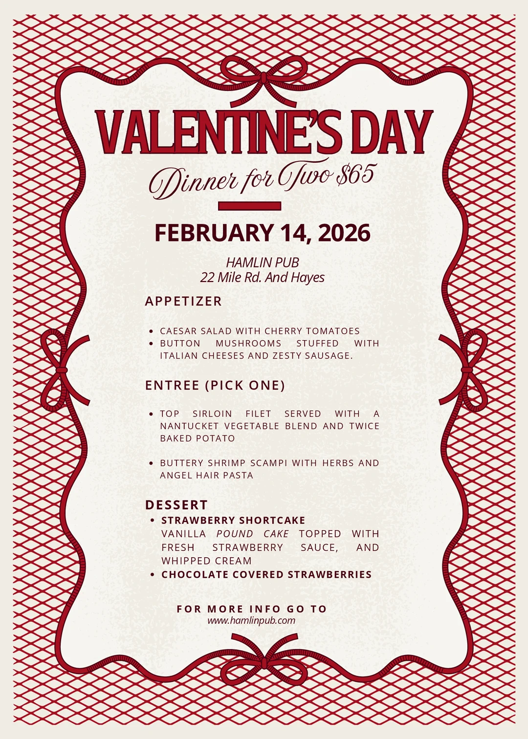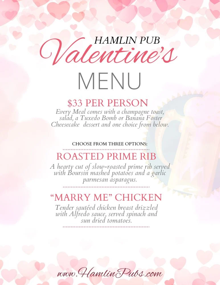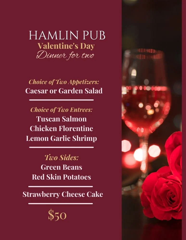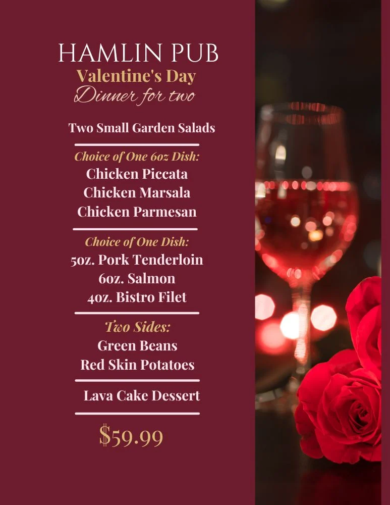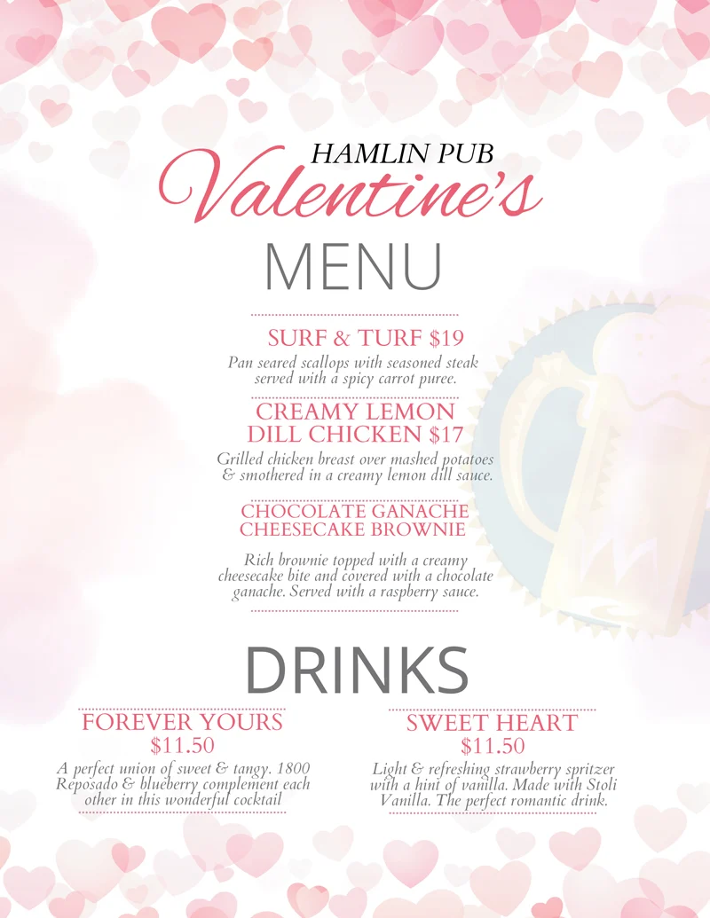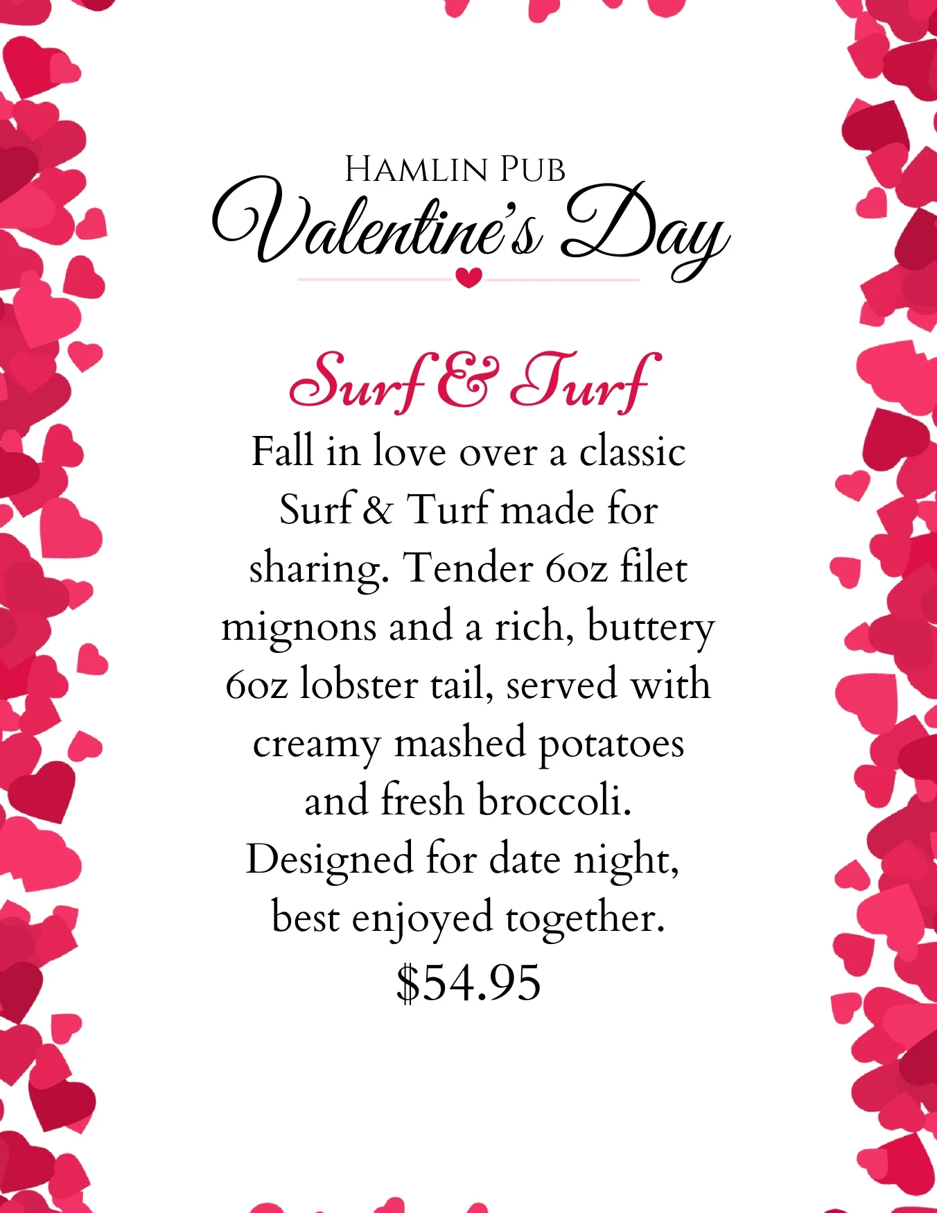 Looking for a Valentine’s Day dinner near you? Hamlin Pub is serving up a Valentine’s Day restaurant special made for an unforgettable night out. Our limited-time Valentine’s Day menu features premium steaks, seafood favorites, chef-crafted entrées, and indulgent desserts — all served in a warm, lively pub atmosphere that’s perfect for date night. Whether you’re planning a romantic Valentine’s dinner, a fun night out with your partner, or a stress-free alternative to fine dining, Hamlin Pub offers one of the best Valentine’s Day dinner specials near you. Available for dine-in only on Valentine’s Day at participating Hamlin Pub locations.